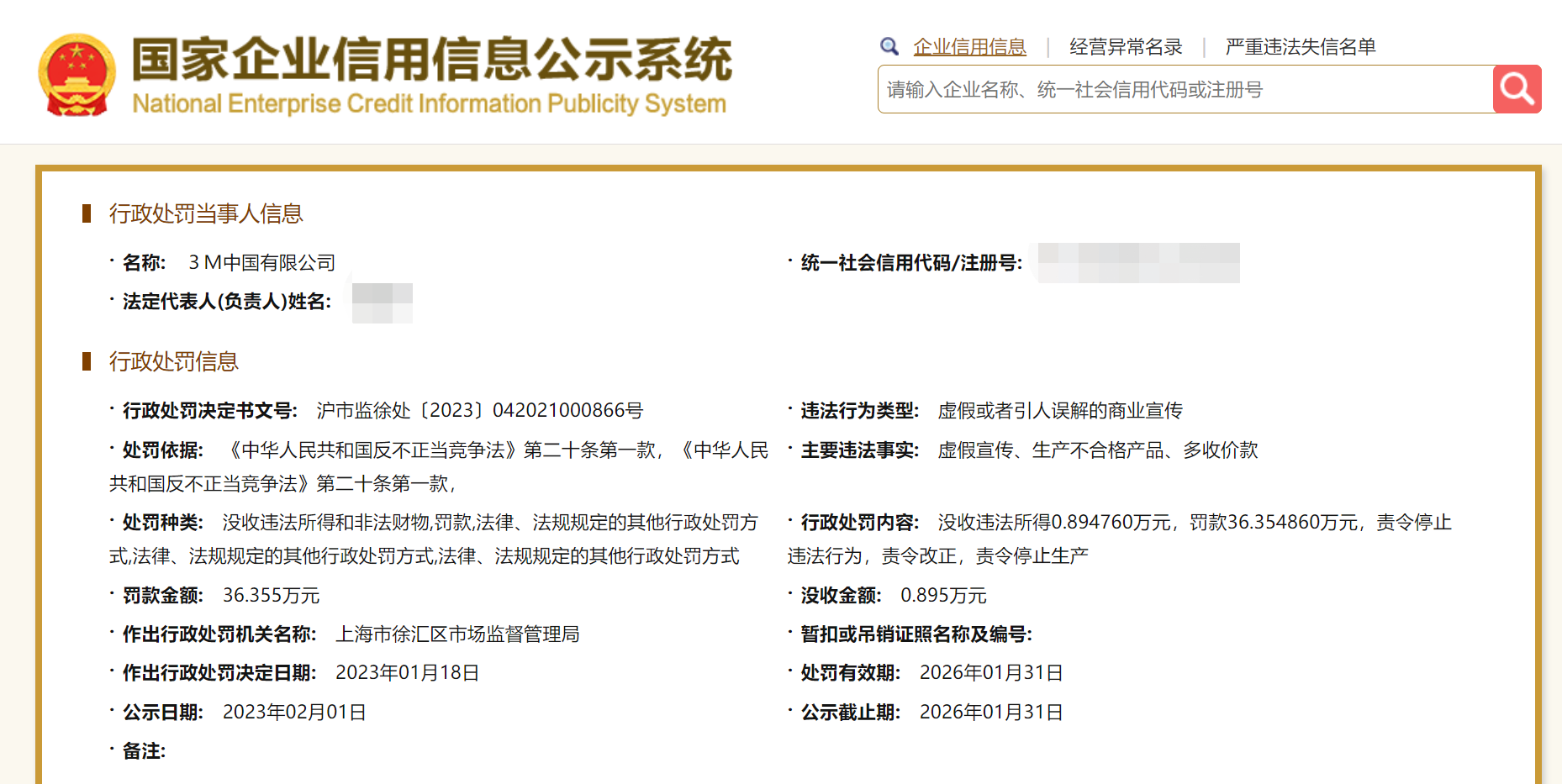 行政處罰信息顯示,3M中國主要違法事實為(wei) 虛假宣傳(chuan) 、生產(chan) 不合格產(chan) 品、多收價(jia) 款。