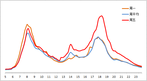 晚高峰期間,東(dong) 、西、北二、三、四、五環,東(dong) 六環部分路段,以及萬(wan) 泉河路至圓明園西路、通惠河北路、蓮石東(dong) 路等城區道路出城方向車流集中,京藏高速、京承高速、京通快速、京港澳高速、機場高速等高速公路出京方向將出現高峰車流,高峰時段為(wei) 17:00—19:00,周五晚高峰提前且持續時間較長。