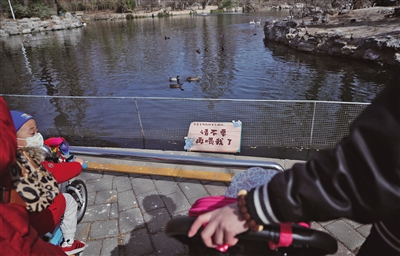 16日上午,在動物園的水禽區域,不少家長帶著孩子在水邊觀鳥,大家用手機拍下小動物們(men) 展翅或在水中覓食的畫麵,但沒有一位家長或者孩子向水中的小鴨子、鵜鶘等私自投喂食物。
