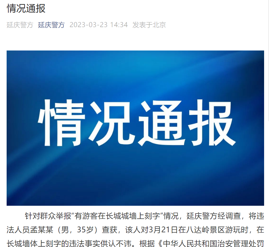 央廣網北京3月23日消息 據延慶警方微信公眾(zhong) 號3月23日情況通報, 針對群眾(zhong) 舉(ju) 報“有遊客在長城城牆上刻字”情況,延慶警方經調查,將違法人員孟某某(男,35歲)查獲,該人對3月21日在八達嶺景區遊玩時,在長城牆體(ti) 上刻字的違法事實供認不諱。根據《中華人民共和國治安管理處罰法》有關(guan) 規定,延慶警方已對孟某某處以行政拘留並處罰款的處罰。