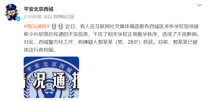 北京西城警方辟謠“多校現場接收小升初簡曆”