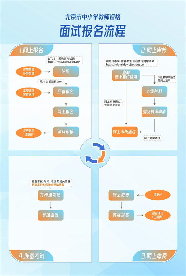 報考麵試流程為(wei) :網上報名→網上審核→網上繳費→查詢準考證→參加麵試→查詢成績。