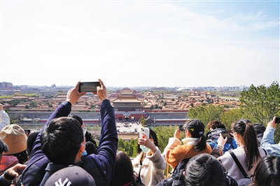 3月26日,景山公園,遊客眺望遠處故宮拍照打卡。新京報記者 王飛 攝