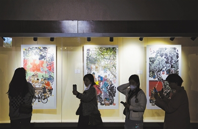 4月5日,遊客在景山公園看《印象中軸 京城記憶——紫禁之巔係列馬海方書(shu) 畫藝術展》。新京報記者 薛珺 攝