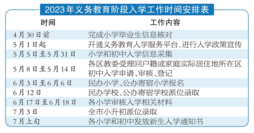 4月30日前,本市將完成小學畢業(ye) 生信息核對;5月1日起,義(yi) 務教育入學服務平台開通,進行入學政策宣傳(chuan) ;5月5日至5月31日,進行小學和初中入學信息采集。