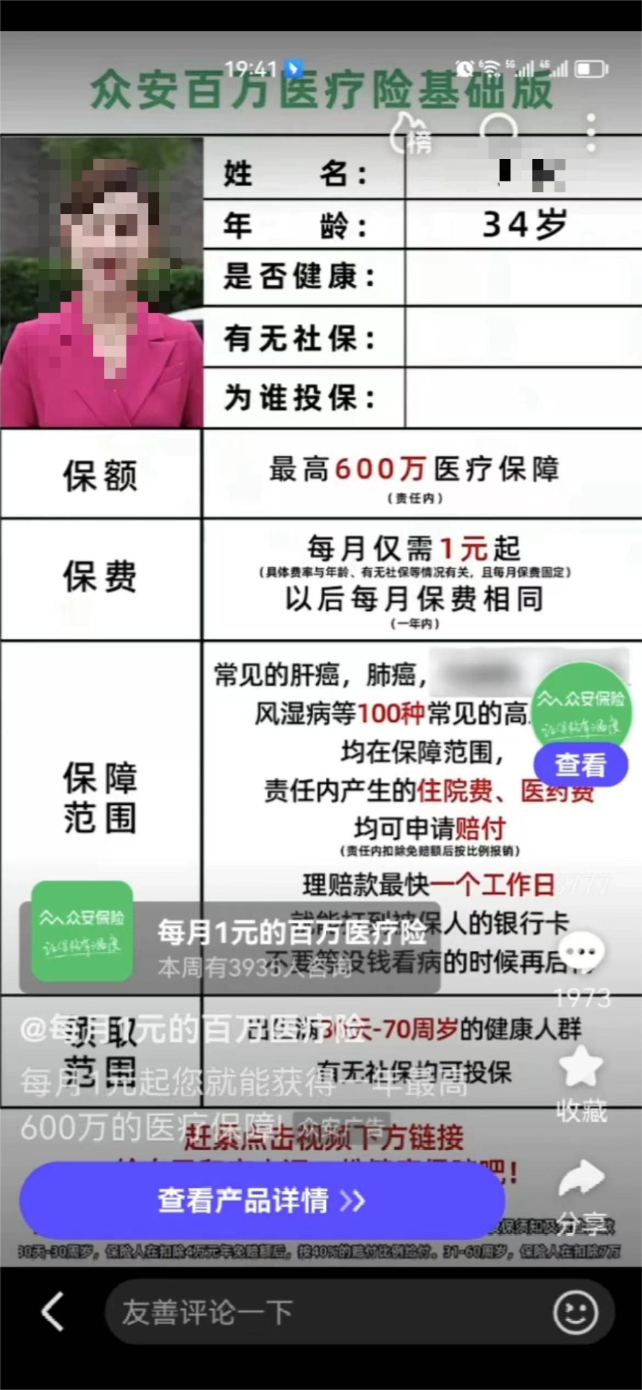 4月22日,記者在某App上刷到一則眾(zhong) 安保險廣告,其廣告頁麵顯示,該保險名為(wei) 眾(zhong) 安百萬(wan) 醫療險基礎版,“最高600萬(wan) 醫療保障,保費每月僅(jin) 需1元起,以後每月保費相同。”