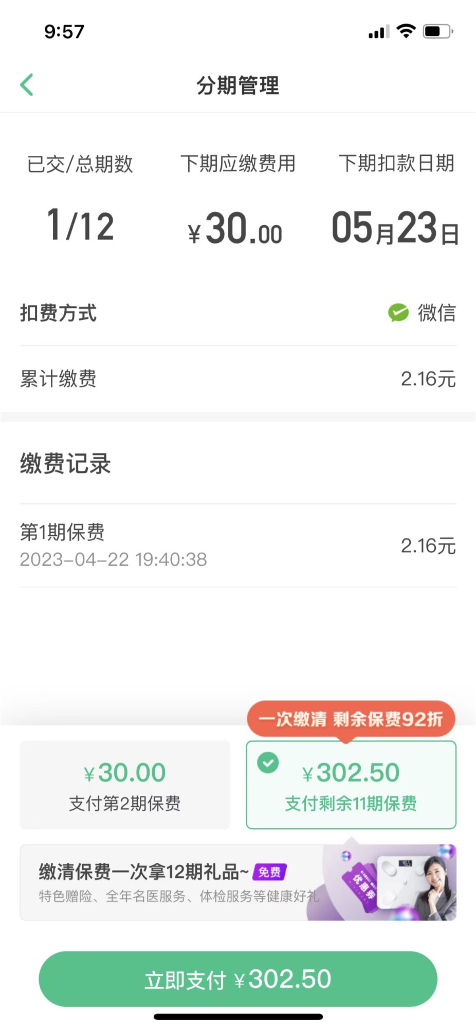 記者在眾(zhong) 安保險App的保單頁麵中看到,所購保險名為(wei) “眾(zhong) 安百萬(wan) 醫療保險2022版”,點擊保單頁中的“去繳費”選項,該保單為(wei) 期一年,目前累計繳費2.16元,但下期應繳費用已變為(wei) 30元。