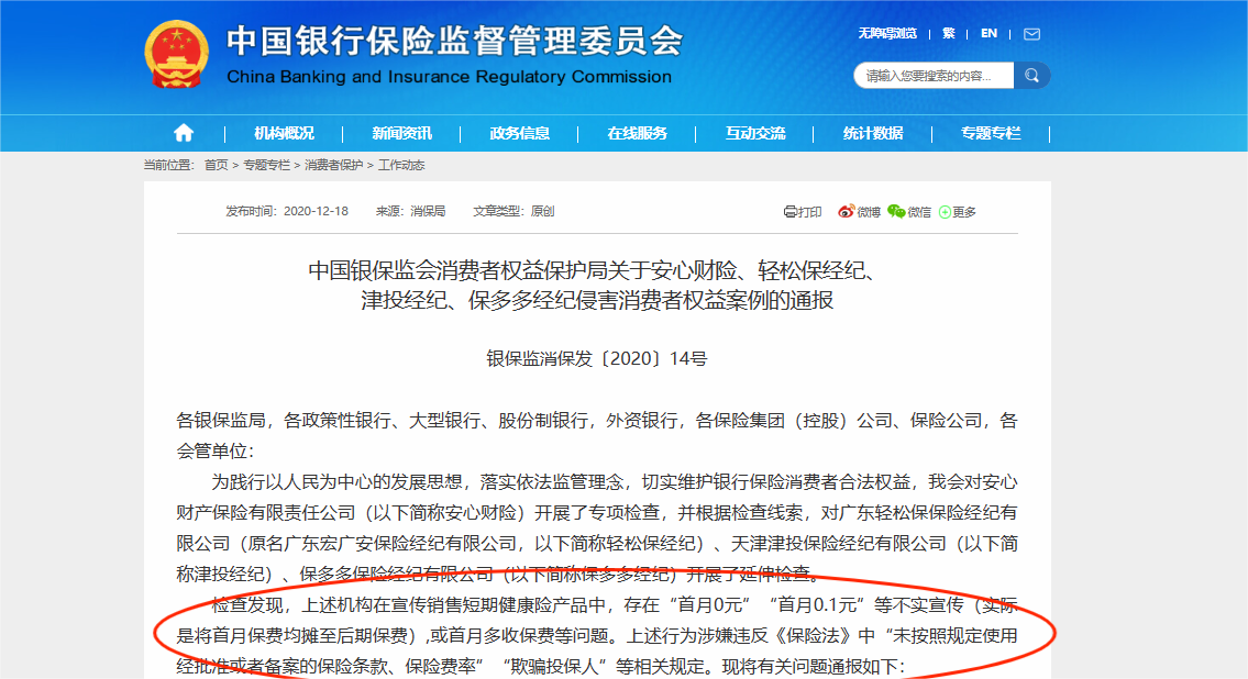 2020年,中國銀保監會(hui) 消費者權益保護局發布關(guan) 於(yu) 安心財險、輕鬆保經紀、津投經紀、保多多經紀侵害消費者權益案例的通報。通報稱檢查發現,上述機構在宣傳(chuan) 銷售短期健康險產(chan) 品中,存在“首月0元”“首月0.1元”等不實宣傳(chuan) (實際是將首月保費均攤至後期保費),或首月多收保費等問題。上述行為(wei) 涉嫌違反保險法中“未按照規定使用經批準或者備案的保險條款、保險費率”“欺騙投保人”等相關(guan) 規定。