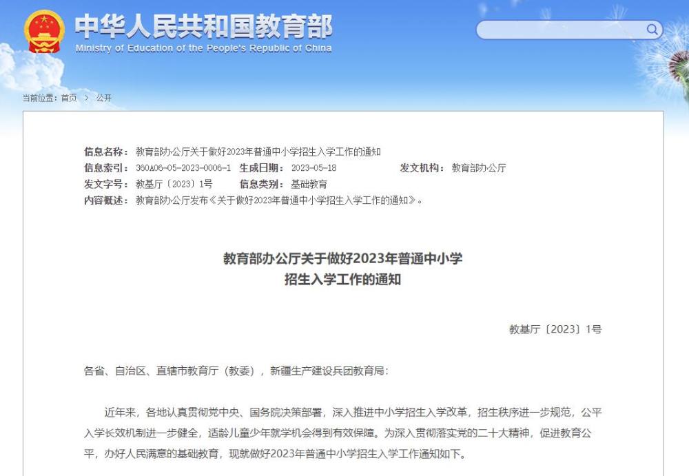 央視網消息:近日,教育部辦公廳發布《關(guan) 於(yu) 做好2023年普通中小學招生入學工作的通知》。主要內(nei) 容如下: