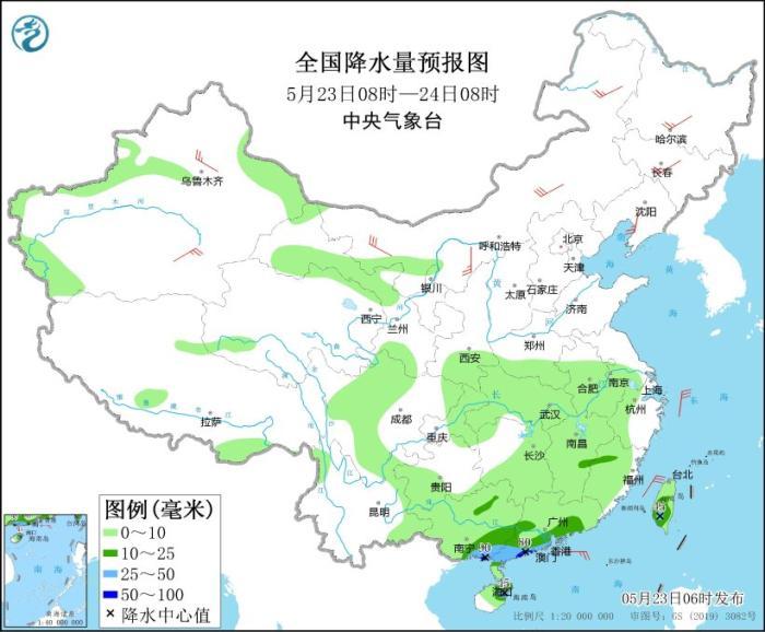 5月23日08時至24日08時,華南南部、台灣島等地部分地區有中到大雨,其中,廣西東(dong) 南部沿海、廣東(dong) 西南部沿海等地局地有暴雨(50~90毫米)。新疆、內(nei) 蒙古中西部和東(dong) 北部等地部分地區有4~6級風。