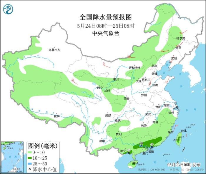 5月24日08時至25日08時,內(nei) 蒙古中東(dong) 部、東(dong) 北地區西部、新疆伊犁河穀和南部、西北地區中東(dong) 部、華北北部、江南東(dong) 部和南部、西南地區東(dong) 部、華南、台灣島等地部分地區有小到中雨,其中,廣東(dong) 中南部等地局地有大雨(25~40毫米)。內(nei) 蒙古、東(dong) 北地區、華北東(dong) 部、黃淮東(dong) 部等地部分地區有4~6級風,其中,內(nei) 蒙古西部部分地區有6~7級風。