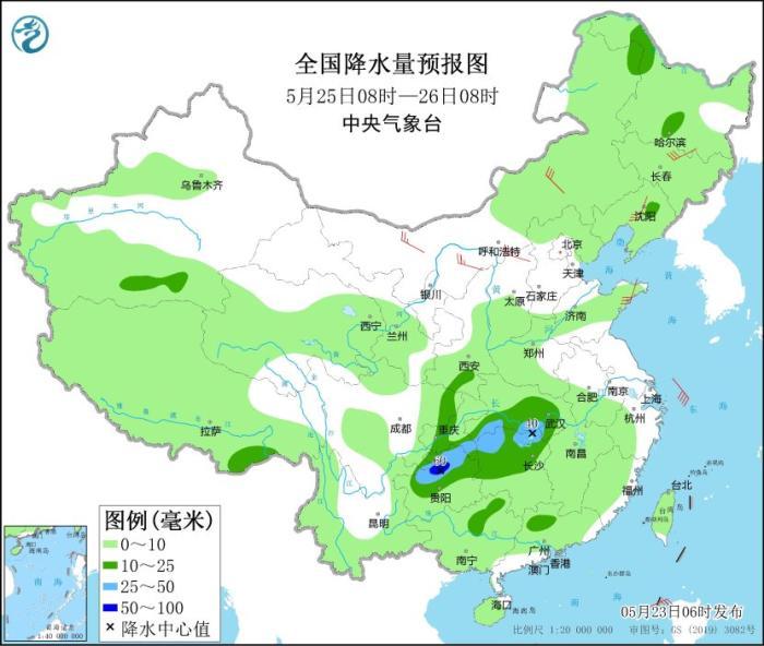 5月25日08時至26日08時,內(nei) 蒙古東(dong) 北部、黑龍江南部、遼寧中北部、江漢、江南北部、西南地區東(dong) 部、廣西東(dong) 北部等地部分地區有中到大雨,其中,貴州北部等地部分地區有暴雨(50~60毫米)。內(nei) 蒙古、東(dong) 北地區、山東(dong) 半島等地的部分地區有4~6級風。