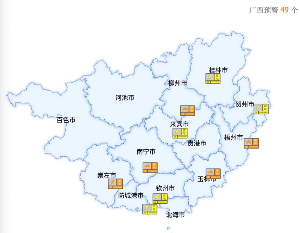 今天(24日),廣西南寧、梧州、玉林等地相繼發布暴雨、雷電等各類氣象預警信息,提醒公眾(zhong) 注意做好相關(guan) 防範工作。截至24日上午9點30分,全區各類預警信息49個(ge) 。