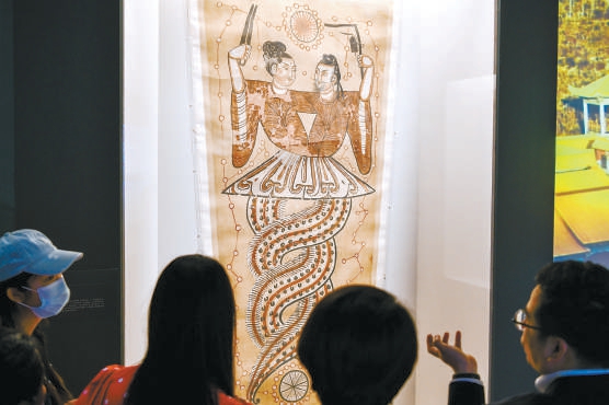 “交融匯聚——新疆精品曆史文物展”近日在國家博物館開幕。展覽展出新疆精品曆史文物209件(組),展現新疆各民族交往交流交融的曆史事實。圖為(wei) 觀眾(zhong) 欣賞伏羲女媧絹畫。 本報記者 鄧偉(wei) 攝