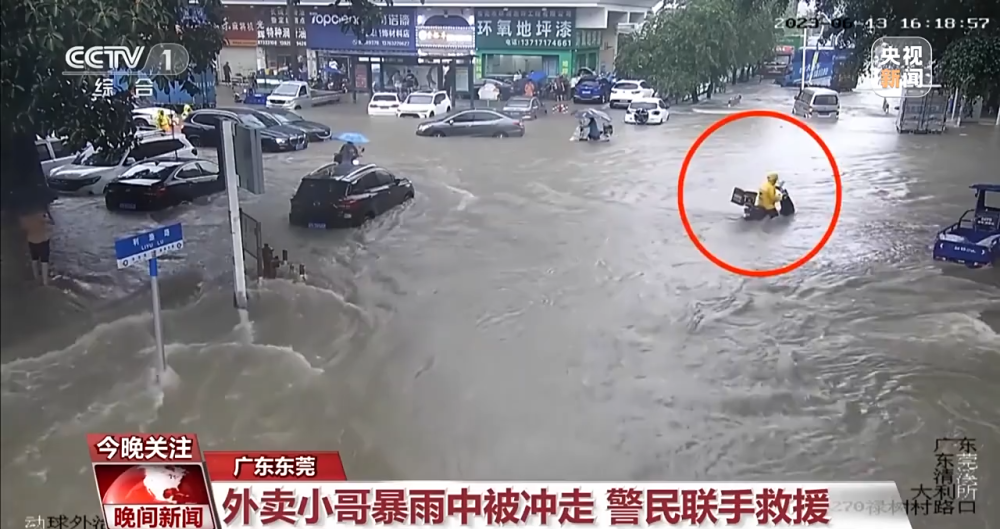 廣東(dong) 東(dong) 莞:外賣小哥暴雨中被衝(chong) 走 警民聯手救援