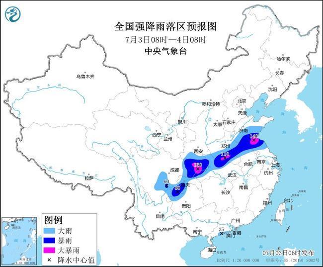 預計,7月3日08時至4日08時,山東(dong) 中南部、江蘇北部、安徽北部、河南東(dong) 部和南部、湖北北部和西部、陝西南部、重慶、四川東(dong) 部、貴州西北部、雲(yun) 南東(dong) 北部以及廣東(dong) 西南部沿海等地部分地區有大到暴雨,其中,山東(dong) 南部、江蘇北部、河南南部、重慶北部、四川東(dong) 北部等地局地有大暴雨(100~160毫米)。上述部分地區伴有短時強降水(最大小時降雨量30~50毫米,局地可超過60毫米),局地有雷暴大風等強對流天氣。
