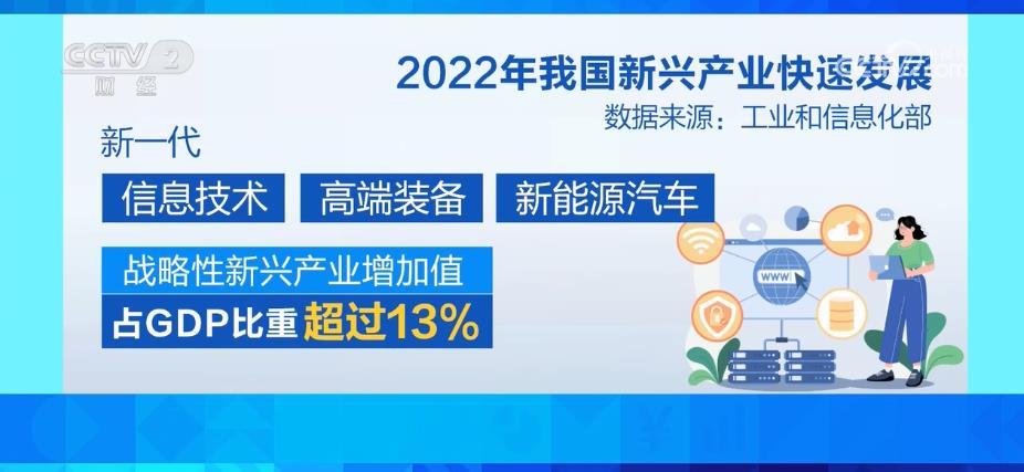 工業(ye) 和信息化部部長金壯龍介紹,2022年,我國新一代信息技術、高端裝備、新能源汽車等戰略性新興(xing) 產(chan) 業(ye) 增加值占GDP比重超過13%。