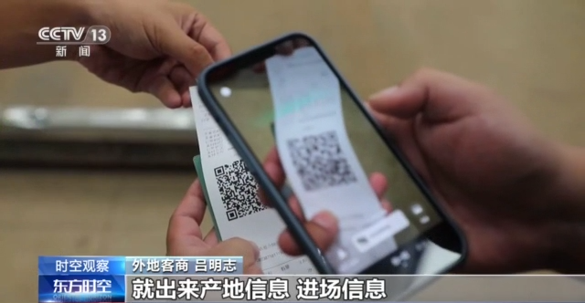 外地客商 呂明誌:通過一卡通消費了之後,掃上邊這個(ge) 追溯碼,就出來產(chan) 地信息、進場信息、檢測信息,還有采摘時間,所以說現在很方便,比較安全。