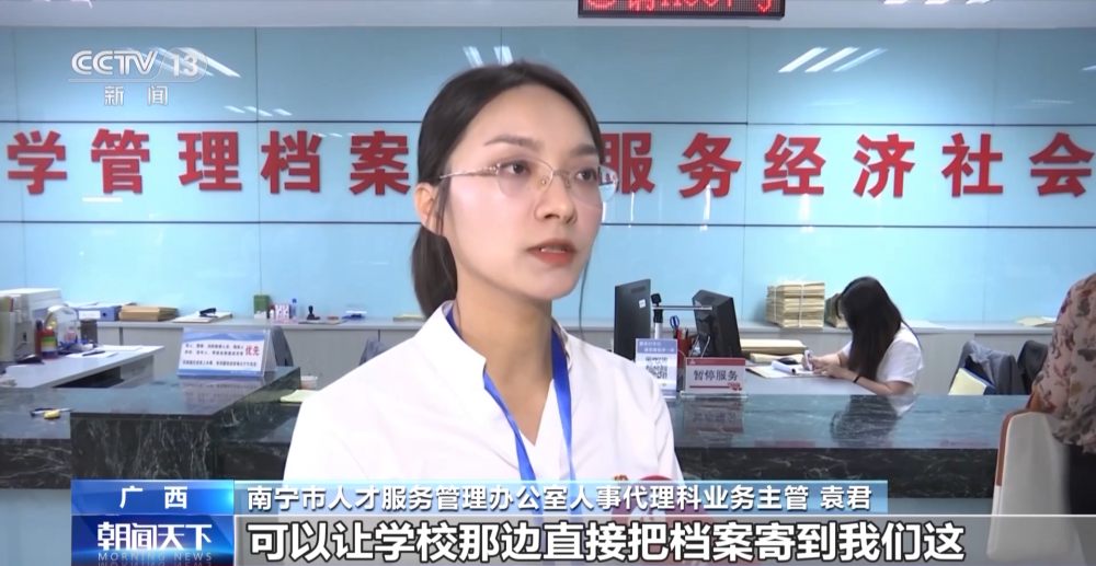 南寧市人才服務管理辦公室人事代理科業(ye) 務主管 袁君:可以讓學校那邊直接把檔案寄到我們(men) 這,我們(men) 進行一個(ge) 免費的托管,不需要學生本人再提供任何的工作材料到現場或者是在網上再辦理任何檔案接收手續。