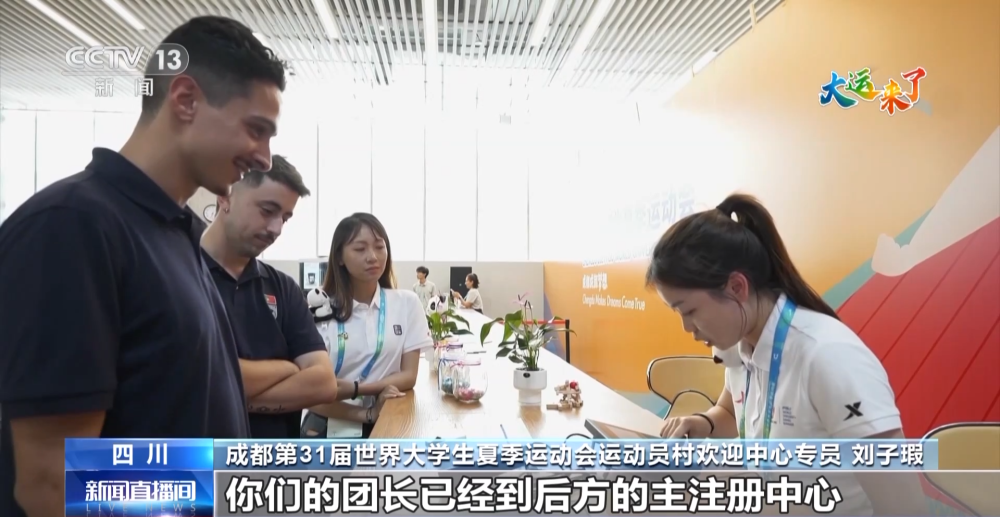 成都第31屆世界大學生夏季運動會(hui) 運動員村歡迎中心專(zhuan) 員 劉子瑕:你們(men) 的團長已經到後方的主注冊(ce) 中心為(wei) 你們(men) 辦理身份注冊(ce) 卡,之後你們(men) 便會(hui) 拿到身份注冊(ce) 卡就可以在大運村內(nei) 通行。