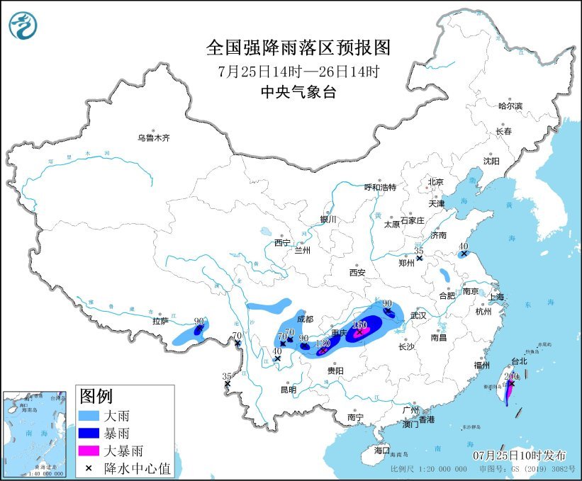 預計,7月25日14時至26日14時,西藏東(dong) 南部、雲(yun) 南西部和東(dong) 北部、四川西部和南部、貴州北部、重慶東(dong) 部、湖北西南部、湖南西北部以及台灣島東(dong) 部等地有大到暴雨,其中,貴州西北部、重慶東(dong) 南部、湖南西北部和台灣島東(dong) 部等地的部分地區有大暴雨(100~200毫米);上述部分地區伴有短時強降水(最大小時降雨量20~50毫米,局地可超過80毫米),局地有雷暴大風等強對流天氣。