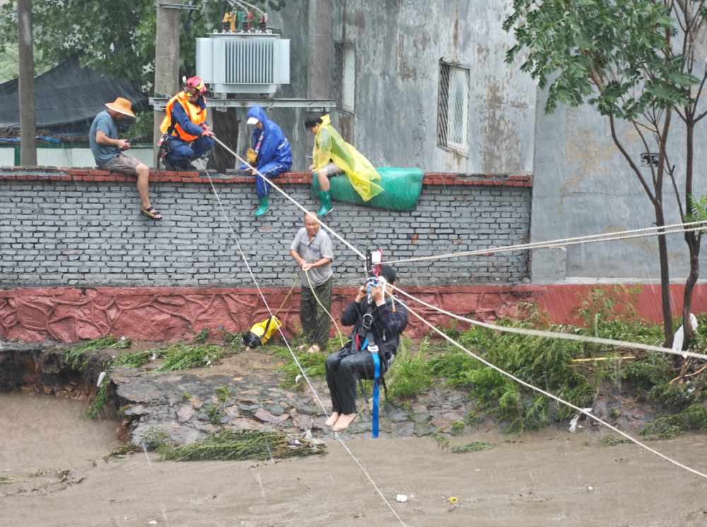 現場,水已經漫過被困人員所處的房屋屋頂,5名群眾(zhong) 被困在高處的牆頭,其中還有1名兒(er) 童。消防救援人員到場後,迅速利用繩索搭建救援通道。15分鍾後,繩橋架設完畢,消防救援人員對被困群眾(zhong) 展開救援。14時10分左右,救援任務成功完成,被困群眾(zhong) 均被轉移到安全地點。