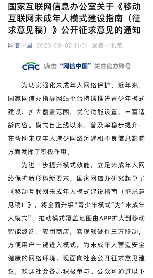 央廣網北京8月3日消息(總台中國之聲記者馮(feng) 爍)據中央廣播電視總台中國之聲報道,為(wei) 進一步幫助未成年人減少網絡沉迷和不良信息影響,國家網信辦8月2日發布了關(guan) 於(yu) 《移動互聯網未成年人模式建設指南(征求意見稿)》(以下簡稱《指南》)公開征求意見,將未成年人網絡保護的覆蓋範圍由App擴大到移動智能終端、應用程序、分發平台,把“青少年模式”升級為(wei) “未成年人模式”。相關(guan) 部門如何給未成年人網絡保護設置護欄?
