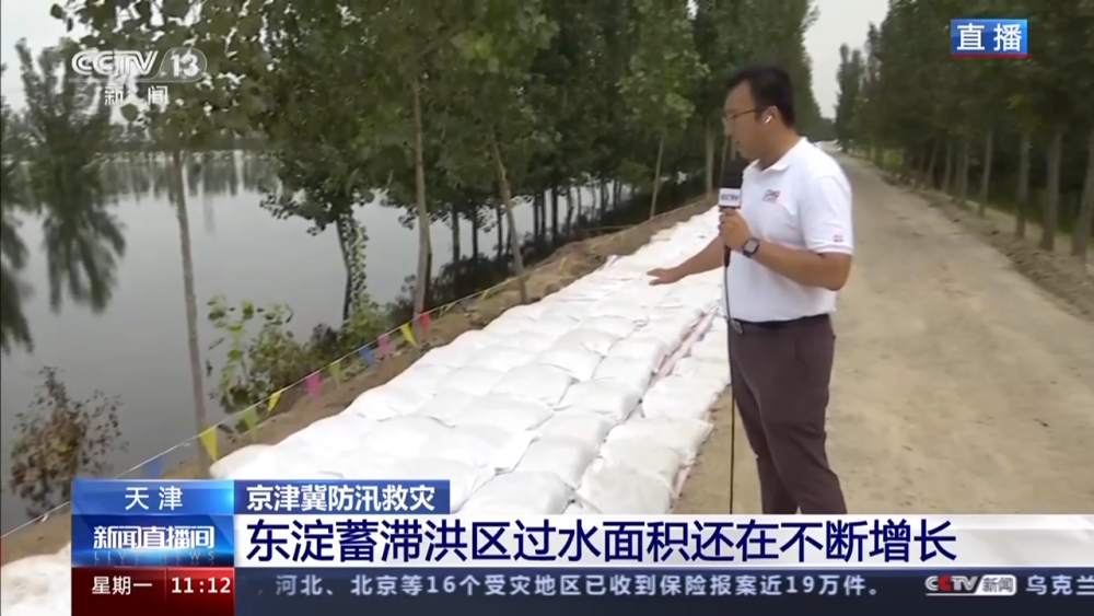 總台央視記者 黃達:我現在所在的位置是靜海區台頭鎮的圍墊上。截至今天9時,大清河水位相較昨天同一時間上漲0.4米。目前水位還在繼續上漲,距離圍墊的頂端還有1米左右的距離。
