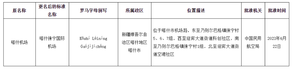 據民政部發布公告,經中國民用航空局批準,喀什機場更名為(wei) 喀什徠寧國際機場。