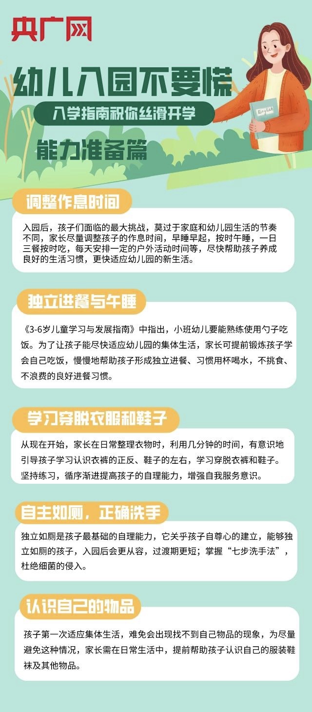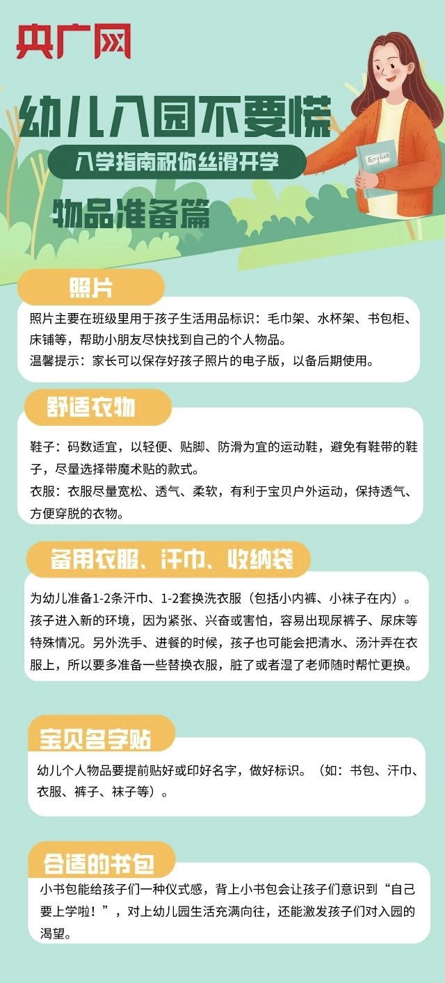 央廣網北京8月27日消息 幼兒(er) 園是人生的第一所學校,在這裏,孩子們(men) 將開啟真正的學習(xi) 生活和社會(hui) 生活。可以說,這一階段對於(yu) 孩子的性格塑造和習(xi) 慣養(yang) 成都有著十分重要的影響。那麽(me) 幼兒(er) 入園前,新手爸媽應該做好哪些準備工作呢?別慌,這份入學指南請收藏!