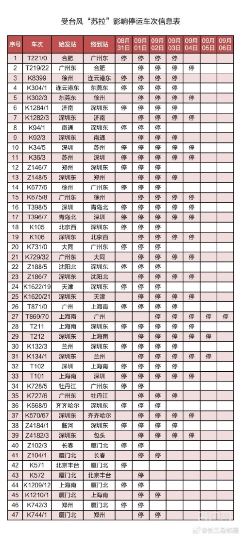 記者從(cong) 中國鐵路上海局集團有限公司獲悉,受第9號台風“蘇拉”影響,為(wei) 確保列車運行安全,鐵路部門計劃對杭深線、京港高鐵、廣深城際、廣深港高鐵、穗深城際、京九線等線路運行的部分列車采取停運措施。截至30日17時30分,計劃停運8月31日至9月6日間共121趟旅客列車:其中停運動車組列車74趟,停運普速列車47趟。