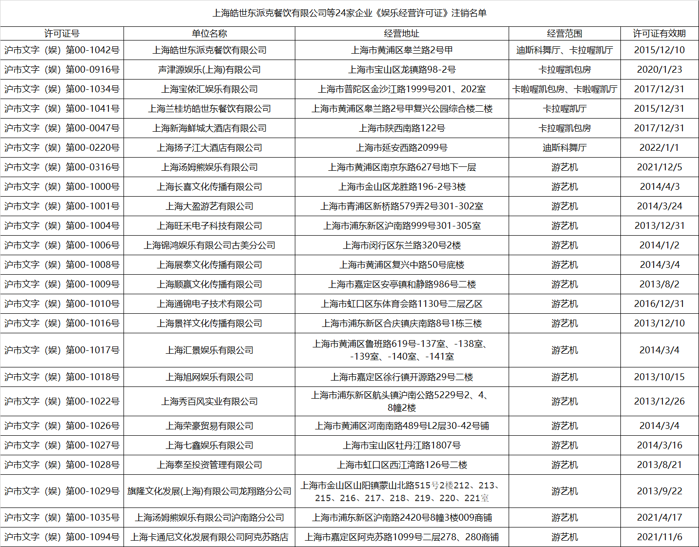 央廣網北京9月20日消息 據上海市文化和旅遊局消息,為(wei) 進一步規範娛樂(le) 市場證照管理,完善市場退出機製,經核查,上海皓世東(dong) 派克餐飲有限公司等24家企業(ye) 所持的《娛樂(le) 經營許可證》有效期屆滿且未按規定申請續證。根據《中華人民共和國行政許可法》《娛樂(le) 場所管理辦法》等法律法規規定,上海市文化和旅遊局依法對上述場所注銷許可證事宜予以公告。