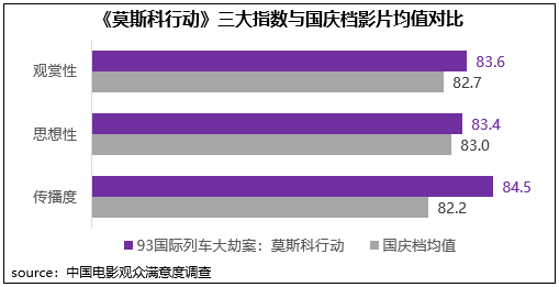 《莫斯科行動》根據20世紀90年代跨境追捕搶劫案犯案件改編,在真實社會(hui) 事件基礎之上有機融入商業(ye) 化要素,三大指數得分均超83分。