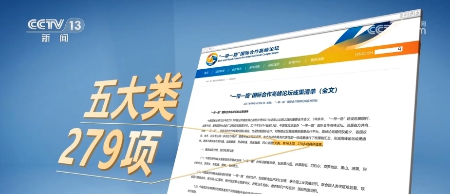 第一屆“一帶一路”國際合作高峰論壇誕生的首張成果清單,涵蓋了五大類的279項具體(ti) 成果。政策溝通、設施聯通、貿易暢通、資金融通、民心相通成為(wei) 各國合作的重點。
