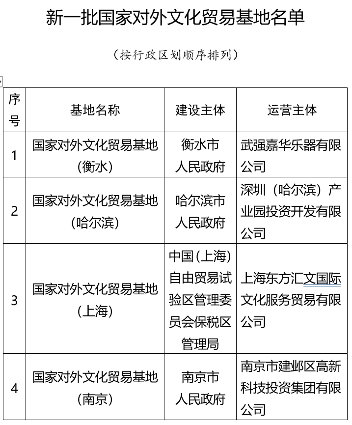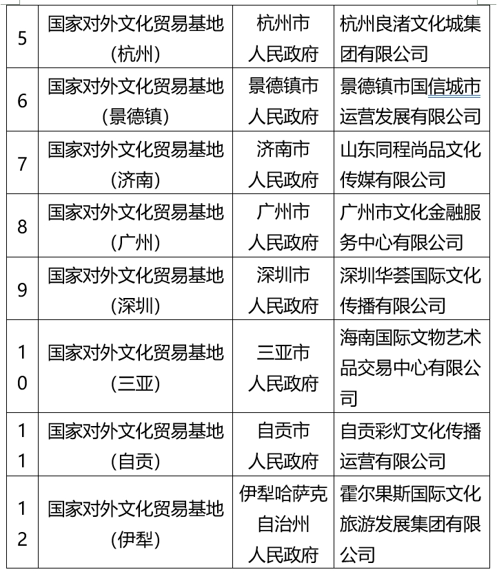 央廣網北京10月19日消息 據文化和旅遊部網站消息,為(wei) 全麵貫徹落實黨(dang) 的二十大精神,推動文化和旅遊對外貿易高質量發展,根據《文化和旅遊部辦公廳 商務部辦公廳關(guan) 於(yu) 開展新一批國家對外文化貿易基地申報工作的通知》(辦產(chan) 業(ye) 發〔2022〕124號),在各省(區、市)、新疆生產(chan) 建設兵團推薦申報基礎上,文化和旅遊部、商務部確定新一批國家對外文化貿易基地(共12家,含複核通過2家),現予公布。