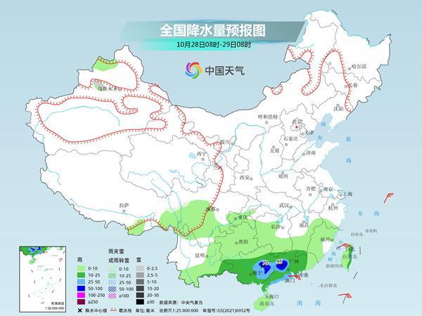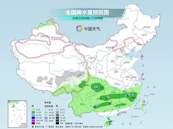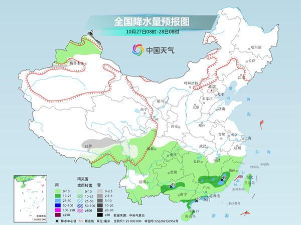 明天開始,降雨的重心將逐漸向華南轉移。預計新疆北疆北部、西藏東(dong) 部等地部分地區有小到中雪或雨夾雪,局地大雪。西南地區大部、江南大部、華南等地有小到中雨,局地大雨。