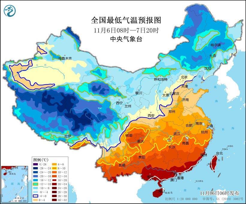 寒潮藍色預警:受強冷空氣影響,預計,11月6日08時至11月7日20時,內(nei) 蒙古東(dong) 部、東(dong) 北地區中南部、黃淮東(dong) 部、江淮東(dong) 部和南部、江南東(dong) 部等地大部將先後降溫6~8℃,其中,內(nei) 蒙古東(dong) 南部、東(dong) 北地區中南部等地部分地區降溫可達10~14℃。最低氣溫0℃線將位於(yu) 河北北部、天津北部、山西南部至陝西關(guan) 中平原、甘肅東(dong) 南部一帶,長江中下遊以北地區有4~6級偏北風,陣風7~9級,局地可達10級;6日至7日夜間,渤海、黃海、東(dong) 海等海域有7~8級風,最大陣風9~11級。