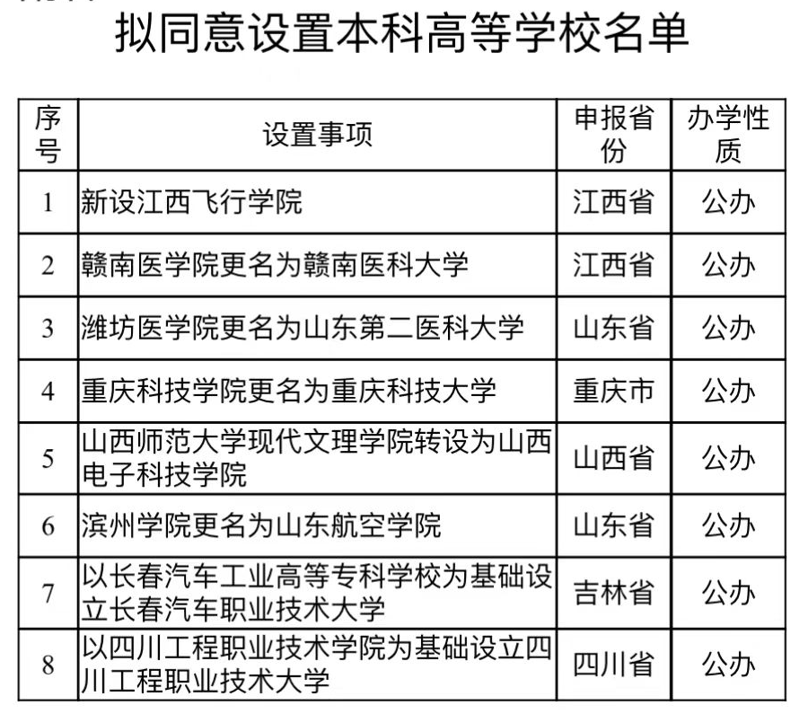 教育部擬同意設置本科高等學校名單(圖源:教育部官方網站)