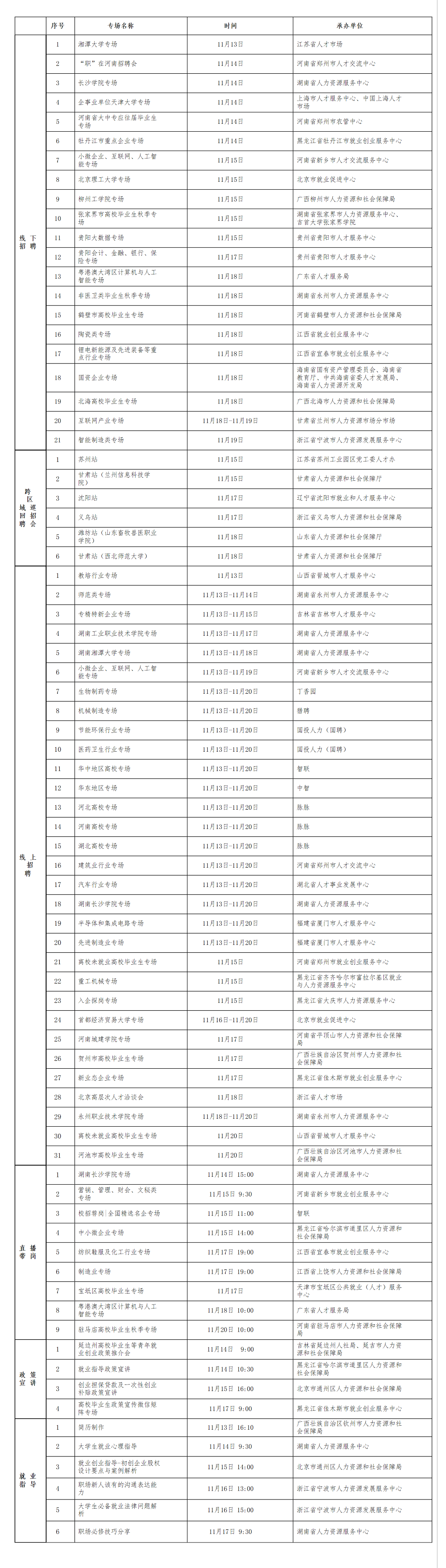 央廣網北京11月15日消息(記者 馮(feng) 儀(yi) )人力資源和社會(hui) 保障部2023年大中城市聯合招聘高校畢業(ye) 生秋季專(zhuan) 場活動近期將推出第四批共77場特色服務活動。包括智能製造類、互聯網產(chan) 業(ye) 、陶瓷類等21場線下專(zhuan) 場招聘會(hui) ,6場跨區域巡回招聘會(hui) ,教培行業(ye) 、生物製藥、機械製造等31場線上專(zhuan) 場招聘會(hui) ,9場直播帶崗活動,4場政策宣講直播(錄播)課以及6場就業(ye) 指導直播(錄播)課。