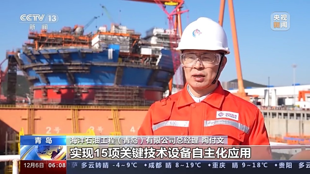 海洋石油工程(青島)有限公司總經理 陶付文:創新采用一體(ti) 化建造工藝和雙龍門吊集成技術,實現15項關(guan) 鍵技術設備自主化應用,使我國具備了根據不同油田、不同海域,自主設計製造不同類型深水油氣裝備的能力。