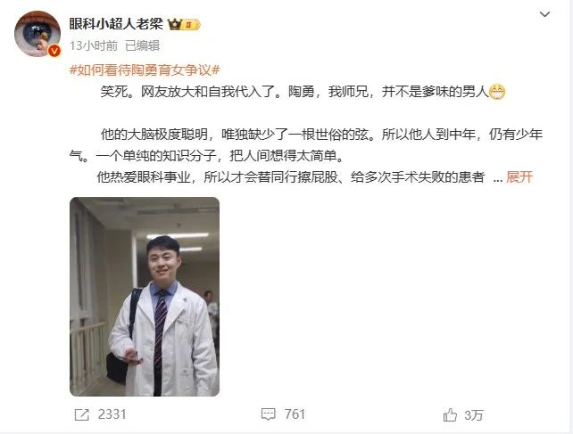 12月24日深夜,擁有超330萬(wan) 粉絲(si) 的醫生大V“眼科小超人老梁”發長文力挺陶勇,稱他是自己的師兄,並不是爹味的男人。文中提到: