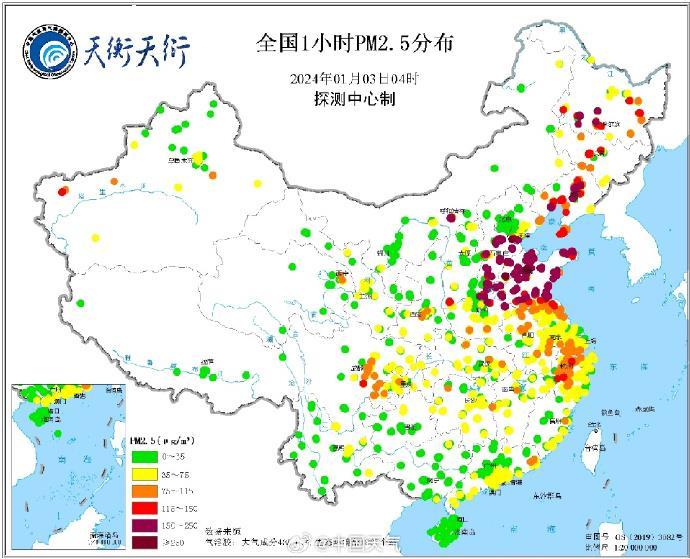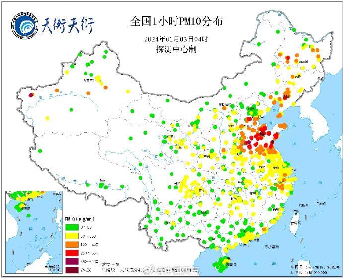 據中國氣象局氣象探測中心綜合觀測產(chan) 品係統(天衡天衍)產(chan) 品顯示,根據1月3日04時全國時均PM10、PM2.5分布圖,河北、山東(dong) 、長三角、川渝等地區PM10、PM2.5濃度較高。最大PM10出現在山東(dong) 青島站,為(wei) 285微克/立方米。最大PM2.5出現在山東(dong) 淄博站,為(wei) 272.6微克/立方米。以上地區PM10大都超過150微克/立方米;PM2.5大都超過115微克/立方米。