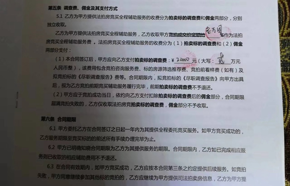 李先生說:“第一次說給錢的時候我沒同意,他又帶我去看同戶型,看了家屬說滿意,就上去叫我們(men) 交錢,承諾是包拍成功,但是合同寫(xie) 的時候隻寫(xie) 了包過戶、包入住、包騰房,然後如果是拍成功過後,沒有成功入住,以房價(jia) 的1.2倍回購,後麵寫(xie) 了個(ge) ‘調查服務費’,就先交錢,交錢之後再給我們(men) 簽合同,說你隻要這次來簽了合同,第二次就來拍成功了,你交傭(yong) 金1萬(wan) 塊,第三次就是你過來拿房產(chan) 證、鑰匙,其他不用你操任何心。”