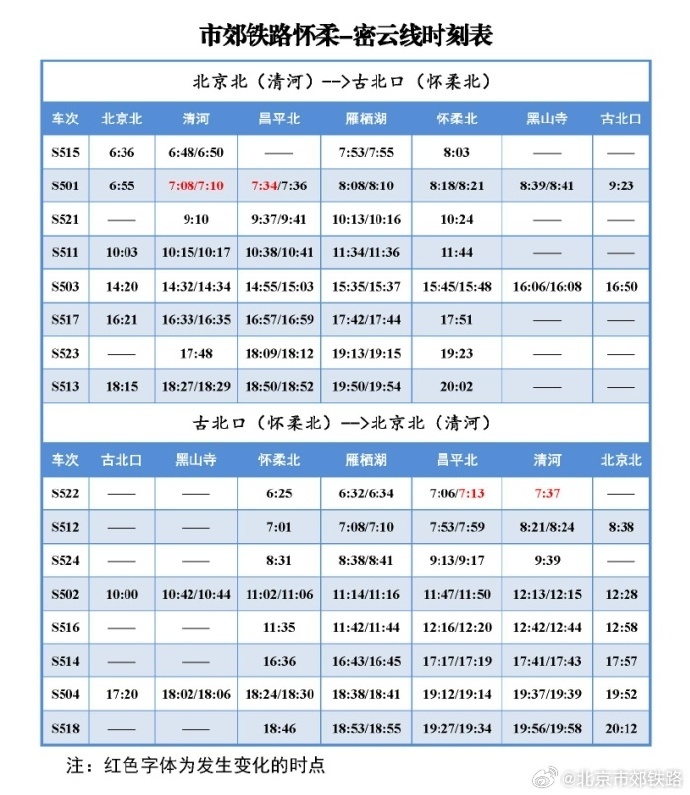 中新網1月9日電 據北京市郊鐵路官方微博消息,2024年1月10日起,北京市郊鐵路懷柔-密雲(yun) 線列車開行時點調整,具體(ti) 列車時刻表如下圖所示: