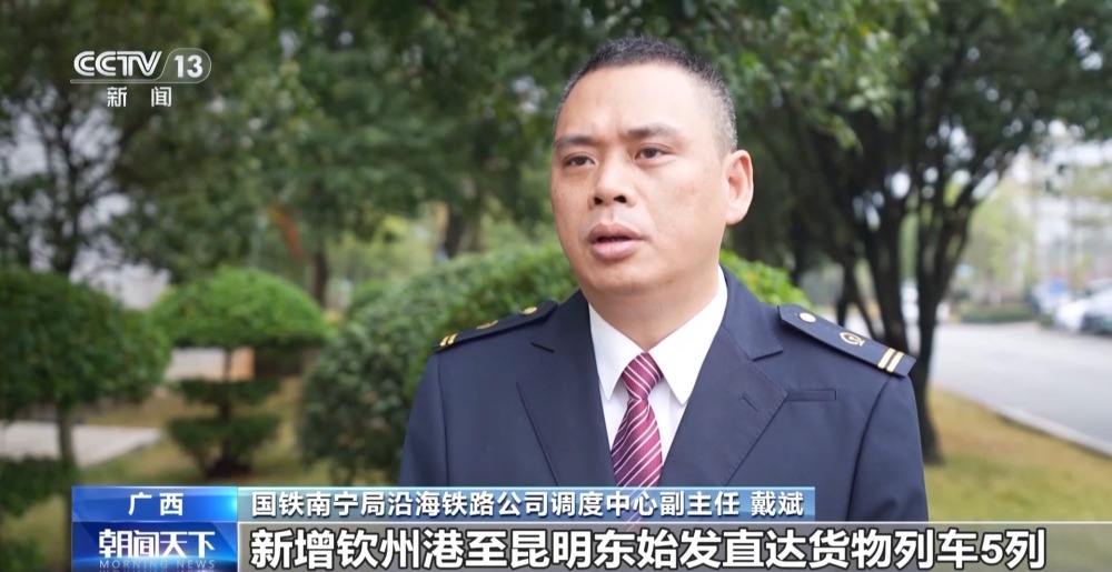 國鐵南寧局沿海鐵路公司調度中心副主任 戴斌:新增欽州港至昆明東(dong) 始發直達貨物列車5列,新增防城港至德保、靖西、田東(dong) 等方向貨物列車4列,不斷延伸西部陸海新通道鐵海聯運班列通達區域。