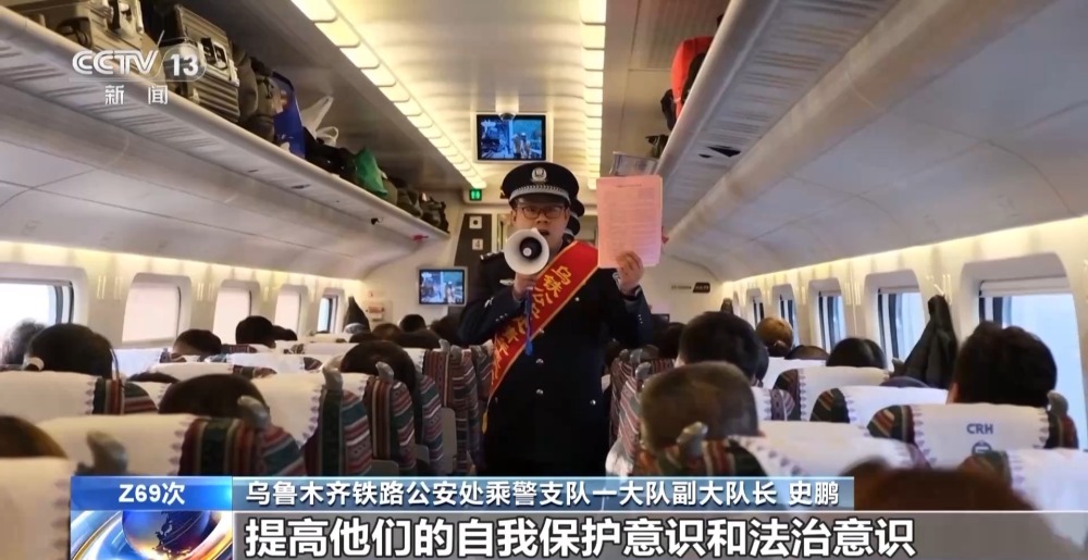 烏(wu) 魯木齊鐵路公安處乘警支隊一大隊副大隊長 史鵬:希望通過這種方式,能夠讓乘坐我們(men) 列車的旅客提高他們(men) 的自我保護意識和法治意識,確保旅客們(men) 平安出行。