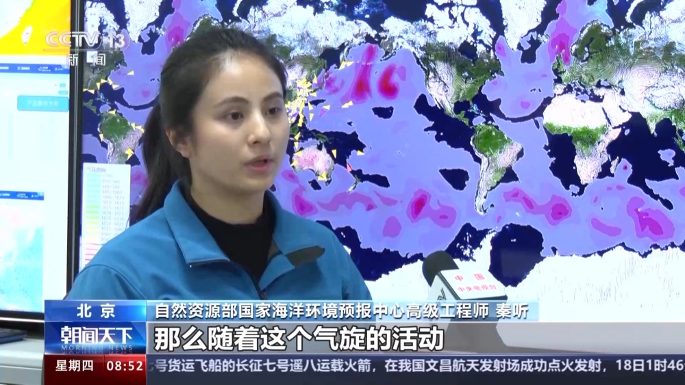 自然資源部國家海洋環境預報中心高級工程師 秦聽:那麽(me) 隨著這個(ge) 氣旋的活動,就會(hui) 造成這種南半球的中低緯度的暖濕氣流,與(yu) 南極的冷氣團之間的碰撞,所形成的這種極地的降雪,以及海霧這種低能見度的一個(ge) 情況,並且會(hui) 引起它作業(ye) 海區的一個(ge) 大風、海浪的這種高海況天氣。