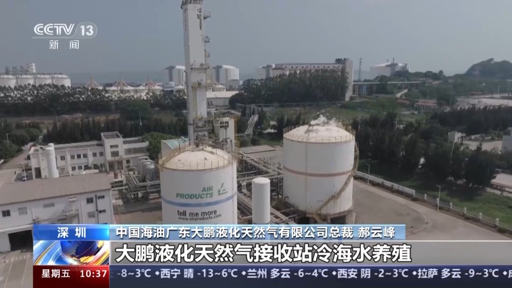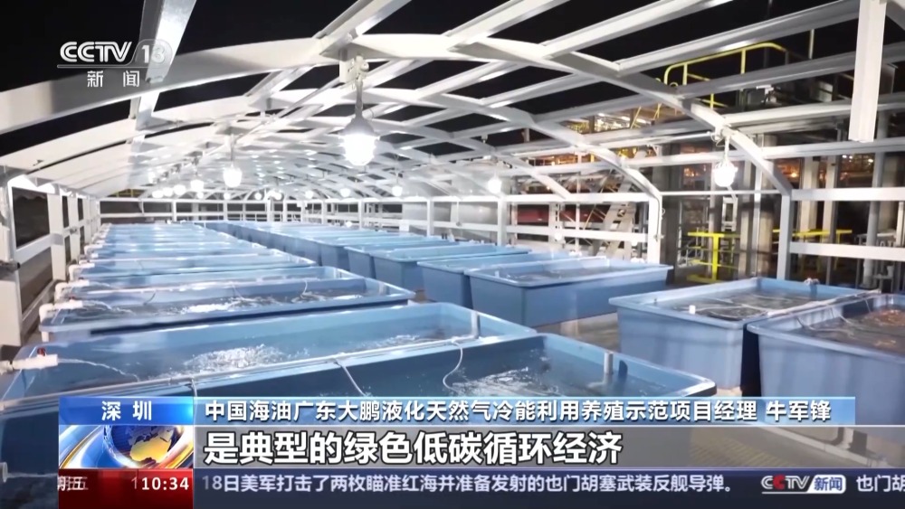 總台央視記者 孫薊濰:我現在是在深圳的大鵬灣,身邊的這些藍色水箱裏養(yang) 殖著龍蝦、鮑魚等各種海鮮,養(yang) 殖這些海產(chan) 品的海水是廣東(dong) 大鵬液化天然氣接收站的生產(chan) 用水。