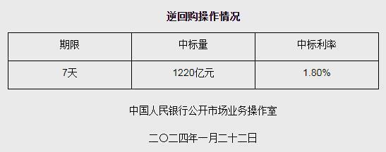 中新網1月22日電 據央行網站消息,為(wei) 維護銀行體(ti) 係流動性合理充裕,2024年1月22日人民銀行以利率招標方式開展了1220億(yi) 元逆回購操作,中標利率1.80%,期限為(wei) 7天。具體(ti) 情況如下:
