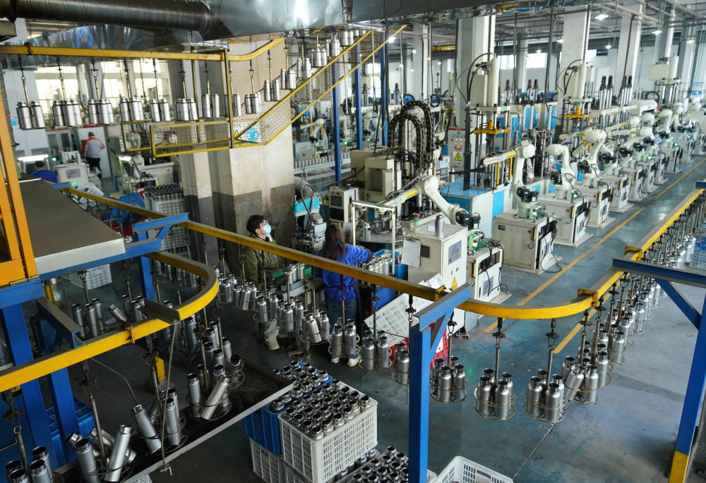 這是2023年12月21日在浙江省永康市一家保溫杯生產(chan) 企業(ye) 拍攝的自動化生產(chan) 流水線。新華社記者 韓傳(chuan) 號 攝